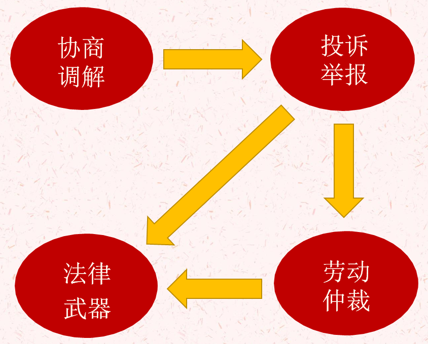 维权前提 维权步骤 自己或在工友、工会、调解委员会的帮助下,按照施工现场维权信息告示牌公布的信息,与工程项目部建设单位、施工总承包单位、劳务分包单位项目负责人进行协商解决问题。 属地行业主管部门 投诉举报 按照维权信息告示牌公布的维权信息,先向行业主管部门举报投诉。 1.住房城乡建设部门:房屋建筑、市政工程 2.交通运输部门:交通建设工程,比如高速公路、普通公路、水运等 3.水利部门:水利工程,比如水库、河道等 4.广西电网公司:电力工程,比如电网改造、电力维护等 5.自治区通信管理局:通信工程,比如移动、联通、电信、信号发射塔等 劳动保障监察投诉举报 如果用人单位有拖欠工资行为,可以向用工所在地的劳动保障监察部门举报或投诉,举报可以匿名,如情况属实,劳动保障监察部门会依据《劳动保障监察条例》依法对用人单位进行监督检查,并责令其支付拖欠的工资。劳动保障监察投诉举报的时效是两年。 各地劳动保障监察机构 投诉举报电话 1.农民工与用人单位在劳动报酬方面发生争议,可以向当地劳动争议仲裁委员会申请仲裁,如情况属实,可通过劳动仲裁下达的判决书,向单位索赔,用人单位不执行的,可申请法院强制执行。申请仲裁的实效是一年。 2.如果劳动仲裁不予受理或者仲裁不公,还可以在15天内到当地法院提起民事诉讼,申请强制执行,如果本人经济比较困难,也可以申请减免诉讼费。 全力保护好农民工的钱袋子 让每一滴汗水 都能获得回报